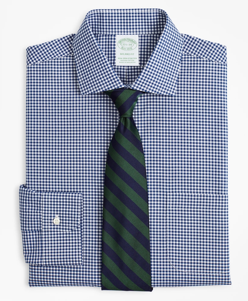 Stretch Milano Slim-Fit Dress Shirt, Non-Iron Poplin English Collar Gingham