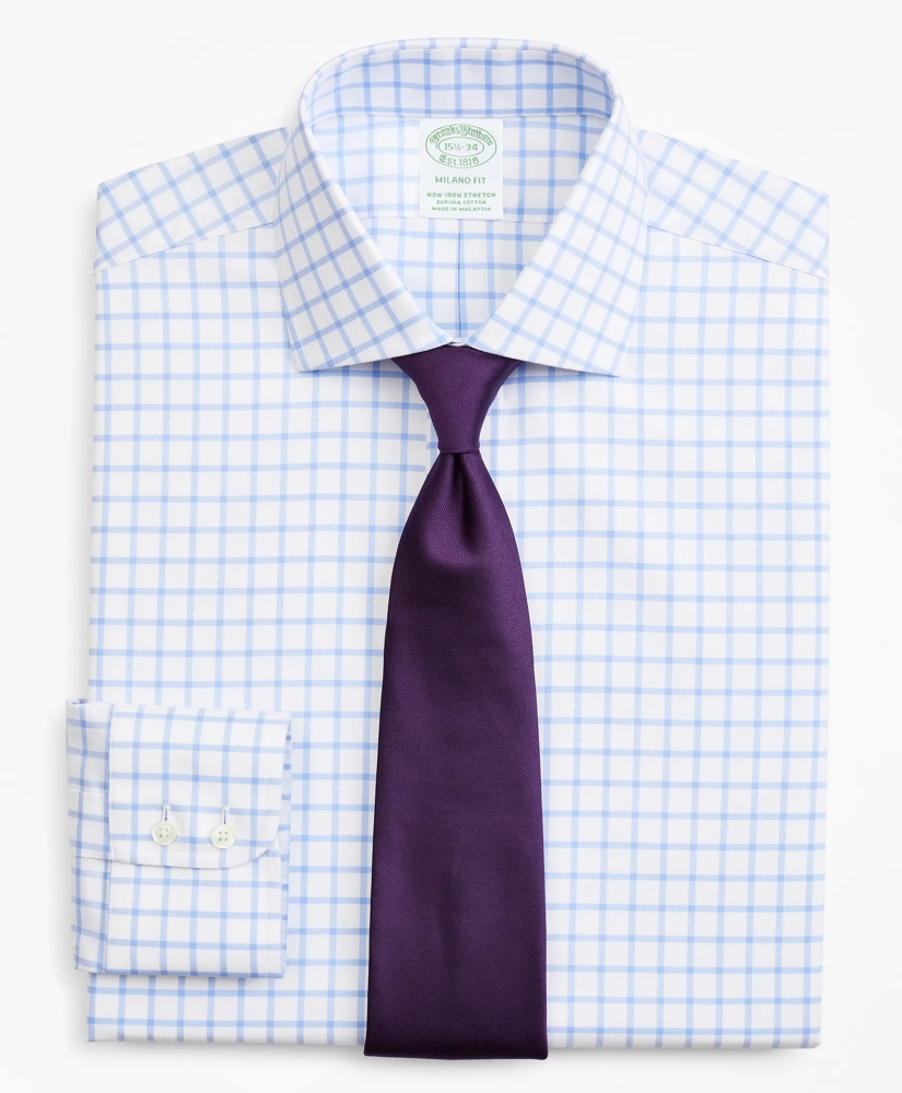 Stretch Milano Slim-Fit Dress Shirt, Non-Iron Twill English Collar Grid Check