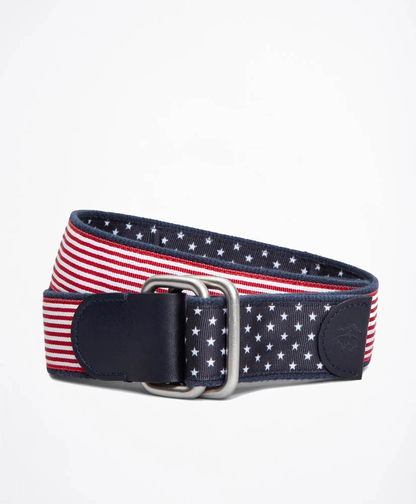 Reversible belt with stripe and dot motif. D-ring closure with leather end tabs.