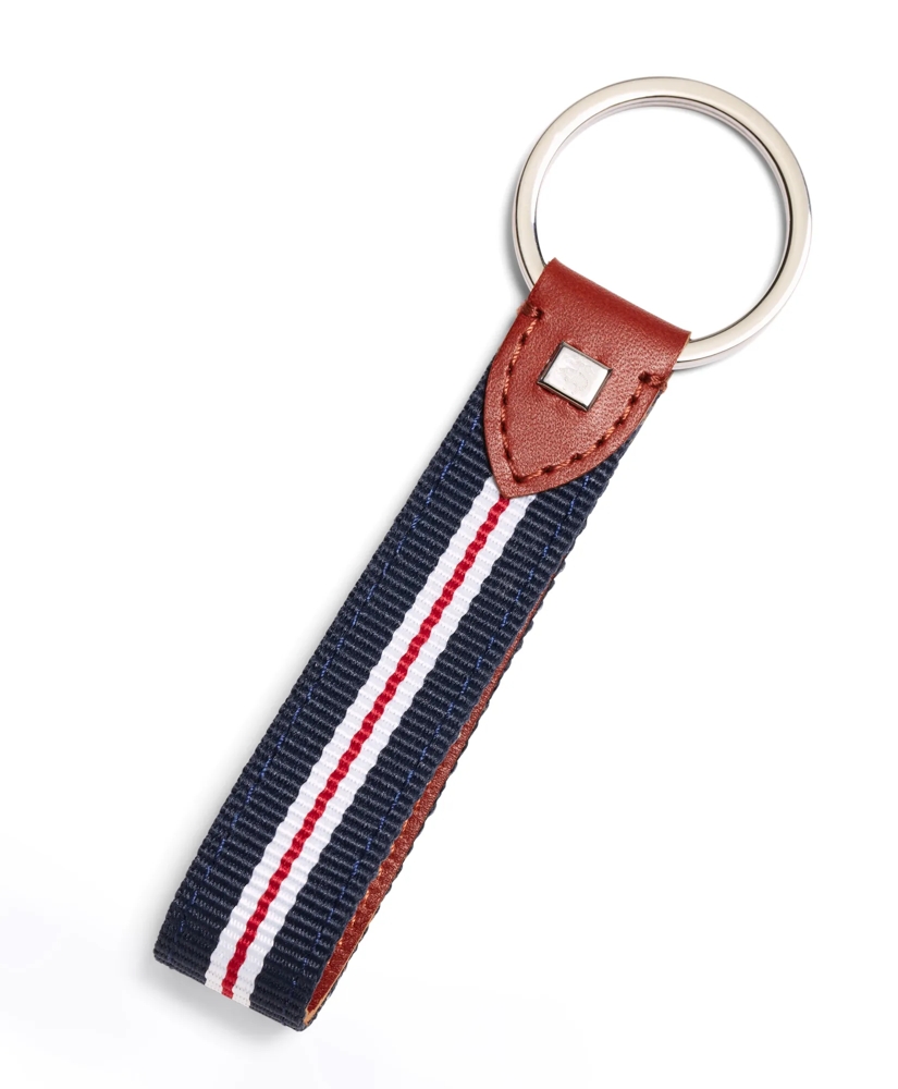 Nylon key fob in colorful stripes. Stainless steel key ring. Genuine leather trim. Detailed with brass Golden Fleece®. Imported. Matching watchbands available.