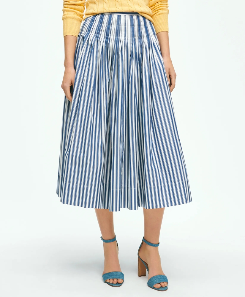 We adore an of-the-moment full skirt, and even more so when it's patterned with flattering vertical stripes that add a point of interest paired with solid Supima® cotton tees, light cotton blouses and crisp button-down shirts. A pleated waistline makes for a lovely additional detail. This skirt is woven from pure cotton without stretch and features a concealed back zipper.