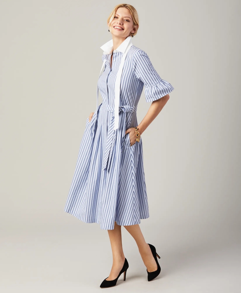 The picture of sweet, feminine style, our classic striped shirt dress is defined by vintage-inspired bell sleeves and a bow at the neckline. Crafted from luxe American-grown Supima® cotton dobby woven with a touch of comfortable stretch, this dress features a bright white point collar, elbow-length bell sleeves, a front button placket, a self-sash to define the waist, a pretty pleated skirt and on-seam side pockets.