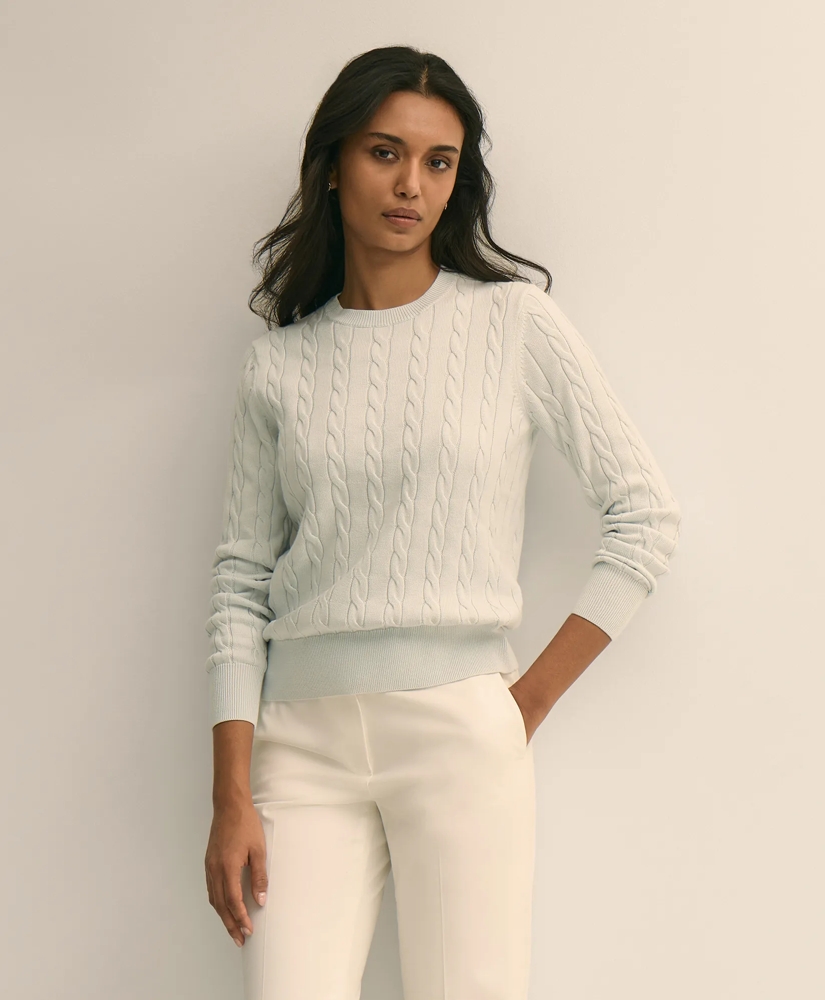 Our classic cable crewneck made from the world's finest Supima® cotton features an enhanced sumptuous handfeel, beautiful color, and the perfect weight to wear on its own or layer for a must-have seasonless piece.