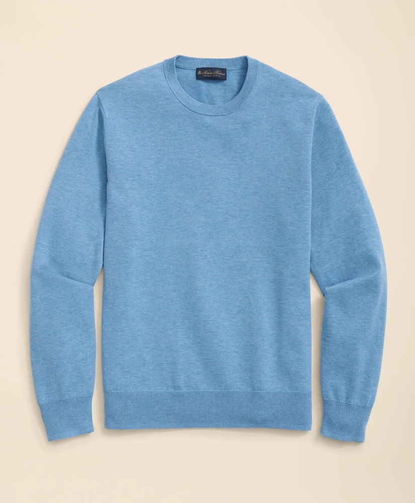 We've improved our Supima® cotton with finer yarn count and gauge for year-round wear. Not only does it look and feel better, but it wears better over time. These updates, along with a tighter tension and finer-gauge construction, have perfected our classic crewneck for seasonless style. Ribbed neck, cuffs and hem.