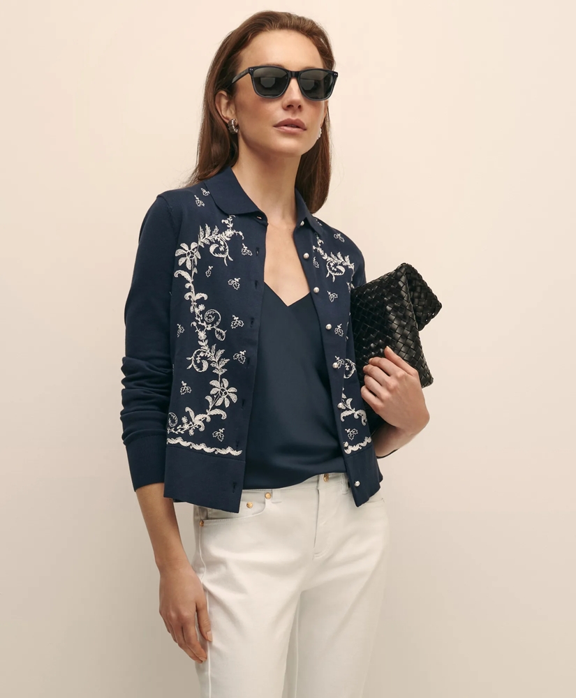 Our classic cardigan made from the world's finest Supima® cotton features an enhanced sumptuous handfeel, beautiful color, and the perfect weight to wear on its own or layer into your favorite looks. We've embroidered a floral motif at front placket for a feminine flourish and sophisticated finish.