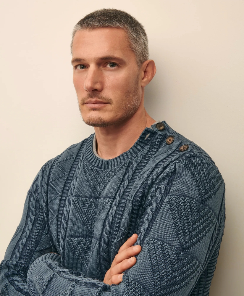 The classic gansey pattern originates from England's Guernsey island. A formidable knit that kept the coastal citizens cozy in cold, windy conditions, ours is crafted from Supima® cotton, the world's finest, and features a crewneck with genuine horn buttons on wear's left shoulder.