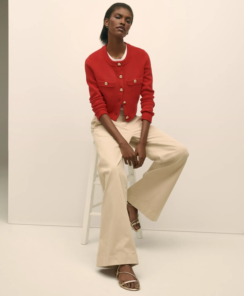 Our classic sweater jacket made from Supima®, the world's finest cotton, features an enhanced sumptuous handfeel, beautiful color and the perfect weight to wear on its own or layer as a must-have all-season piece. We designed it in a statement red with contrast gold-tone buttons, making it a timeless addition to any wardrobe.