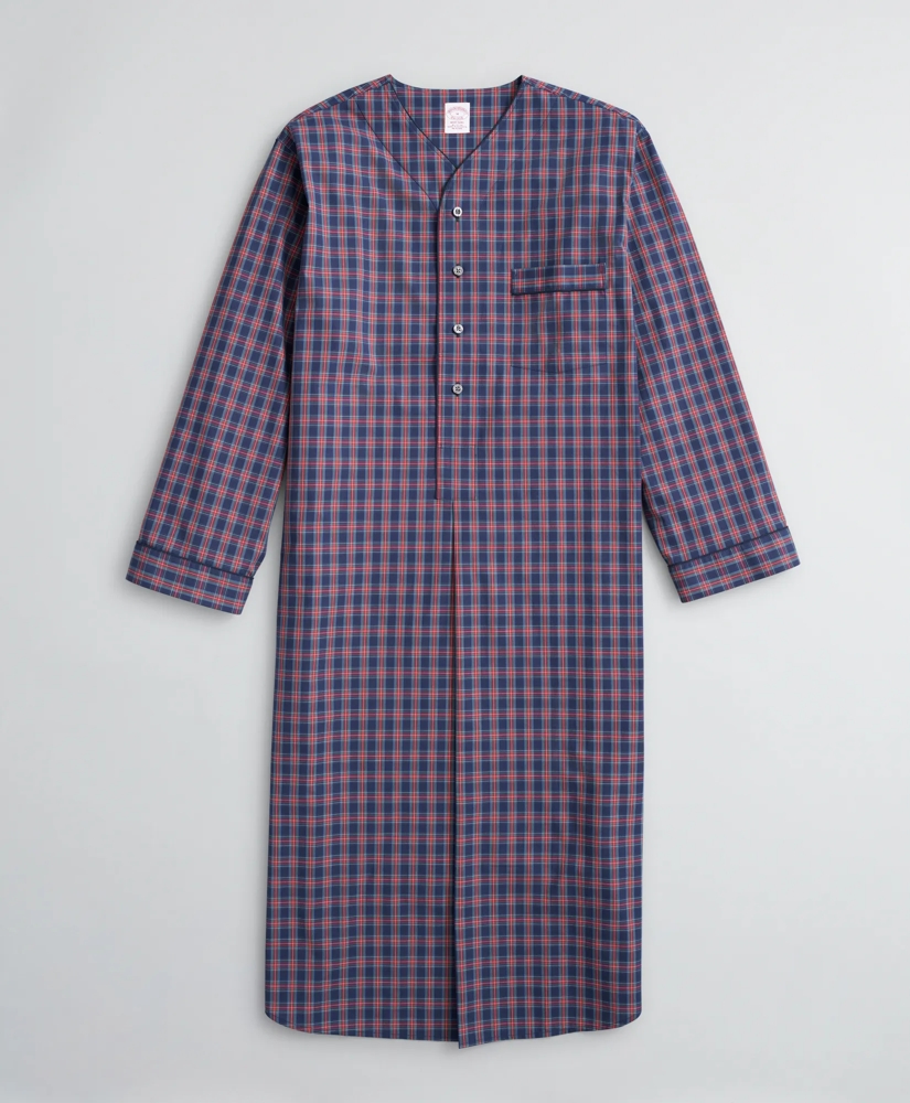 Long-sleeve nightshirt made from pure cotton broadcloth. V-neck button front. Rounded hem with side vents. Piped edges.