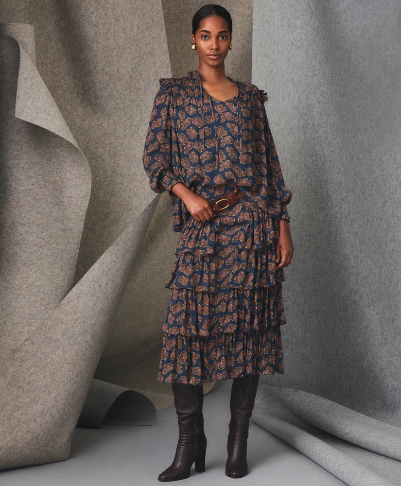 In a standout seasonal paisley print, our tiered skirt boasts beautiful movement with its airy chiffon tiers for a feminine flourish that pairs well with boots and ballet flats. Top it off with fine merino sweaters, twinsets and silk underpinnings, for a sophisticated finish.