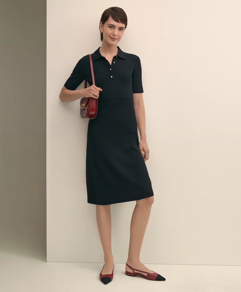 We reimagined the polo in a ribbed knit, then added short sleeves, and ball shank metal buttons at the placket. The fit-and-flare silhouette flatters, while the 42-inch length offers a perfect balance of sophistication and ease.