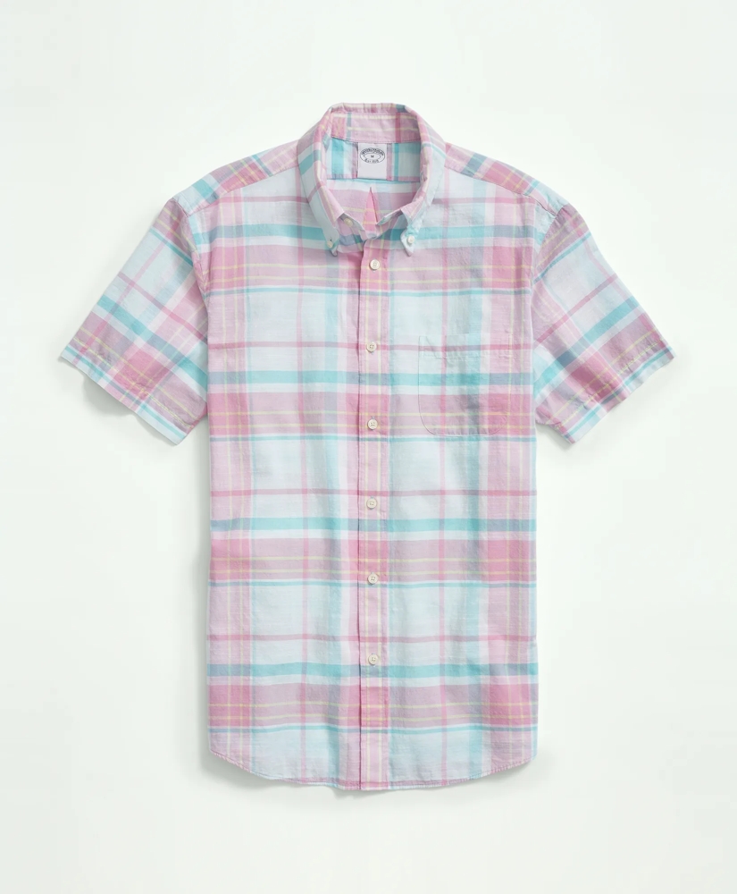 Washed Cotton Madras Button-Down Collar Short-Sleeve Sport Shirt