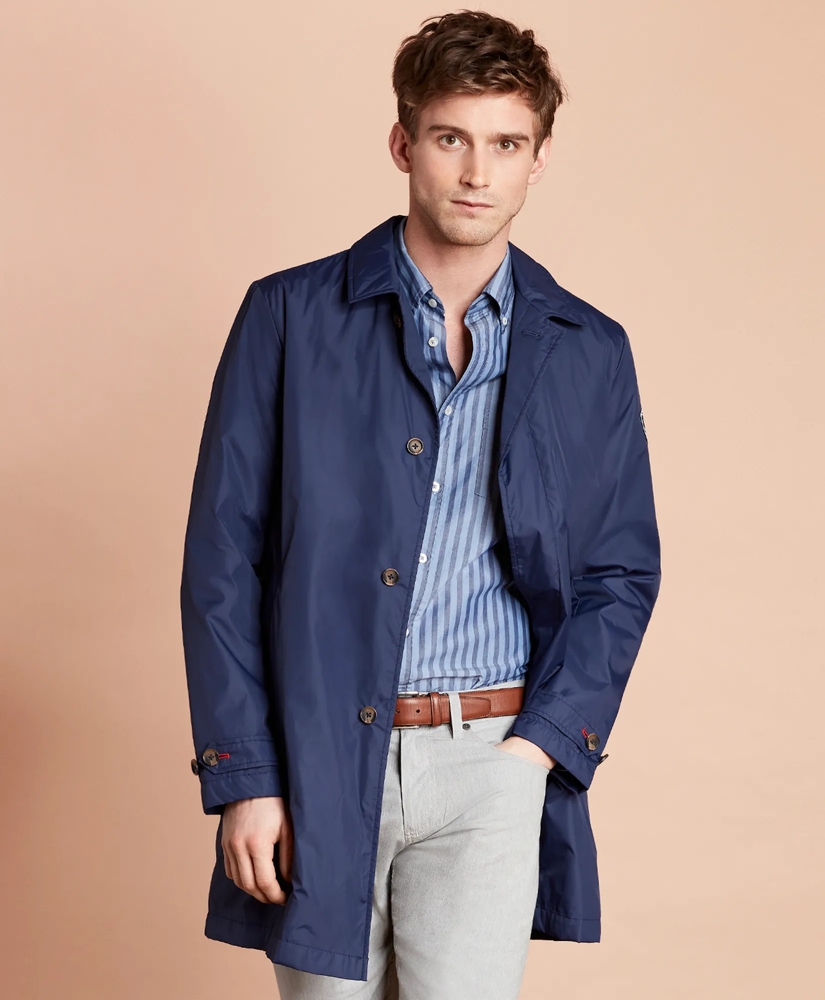 This packable trench coat is the ideal travel companion. Made from a lightweight, water-repellent nylon, this stylish jacket has a hidden pocket that allows it to be packed into itself for easy storage and accessibility. The interior has a zip chest pocket with a slot for headphones, our Red Fleece NYC logo appears on a patch at the shoulder.