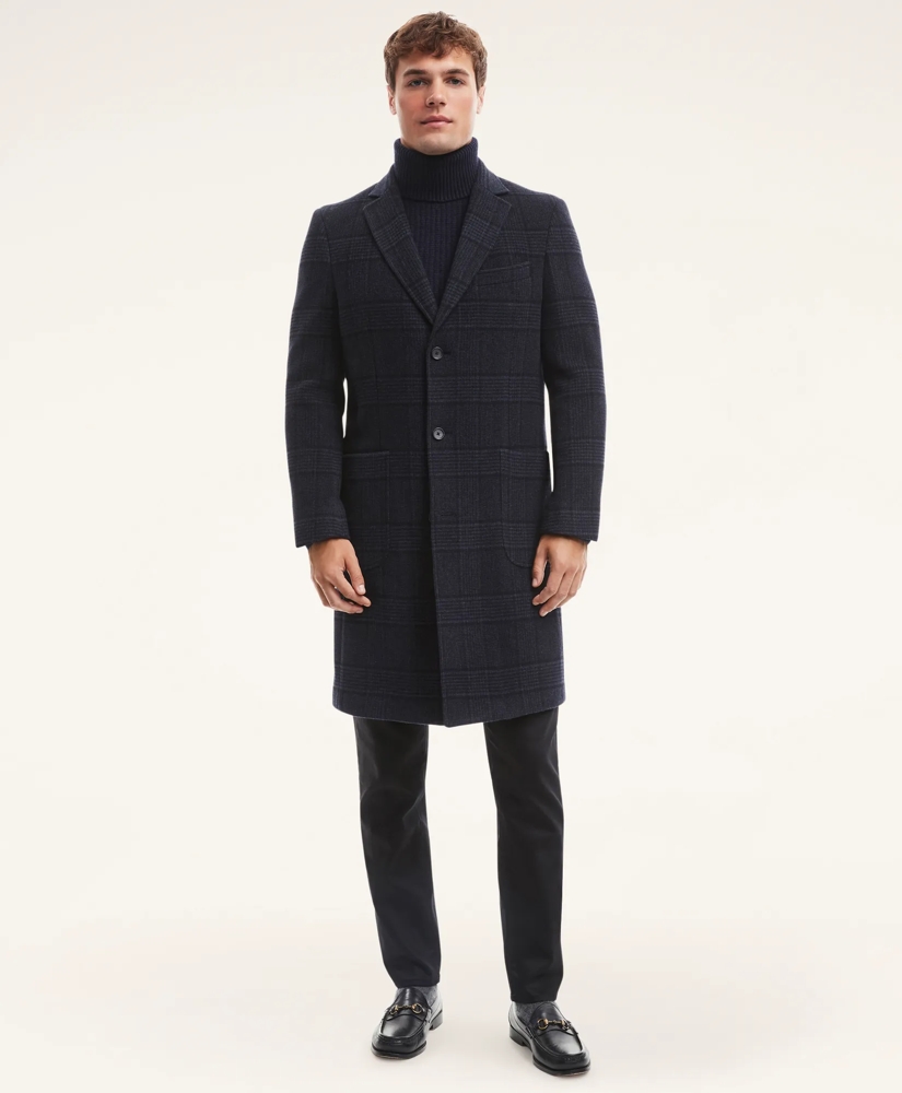 In traditional glen plaid, our top coat is made from double-faced wool woven in Italy. Warmth and durability; its soft, unconstructed shoulder blends comfort with a must-have updated classic.
