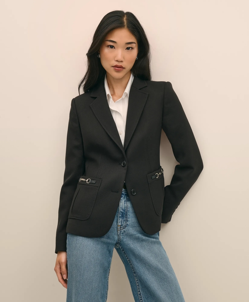 A nod to our seasonal equestrian inspiration, this two-button blazer is distinguished by polished metal horsebit detailing at the pockets and real horn buttons. We crafted it from a refined wool blend, and tailored it with front darts and subtle shoulder pads to create a strong, fitted silhouette. A timeless piece that pairs effortlessly with fitted shirts and silk layers alike.
