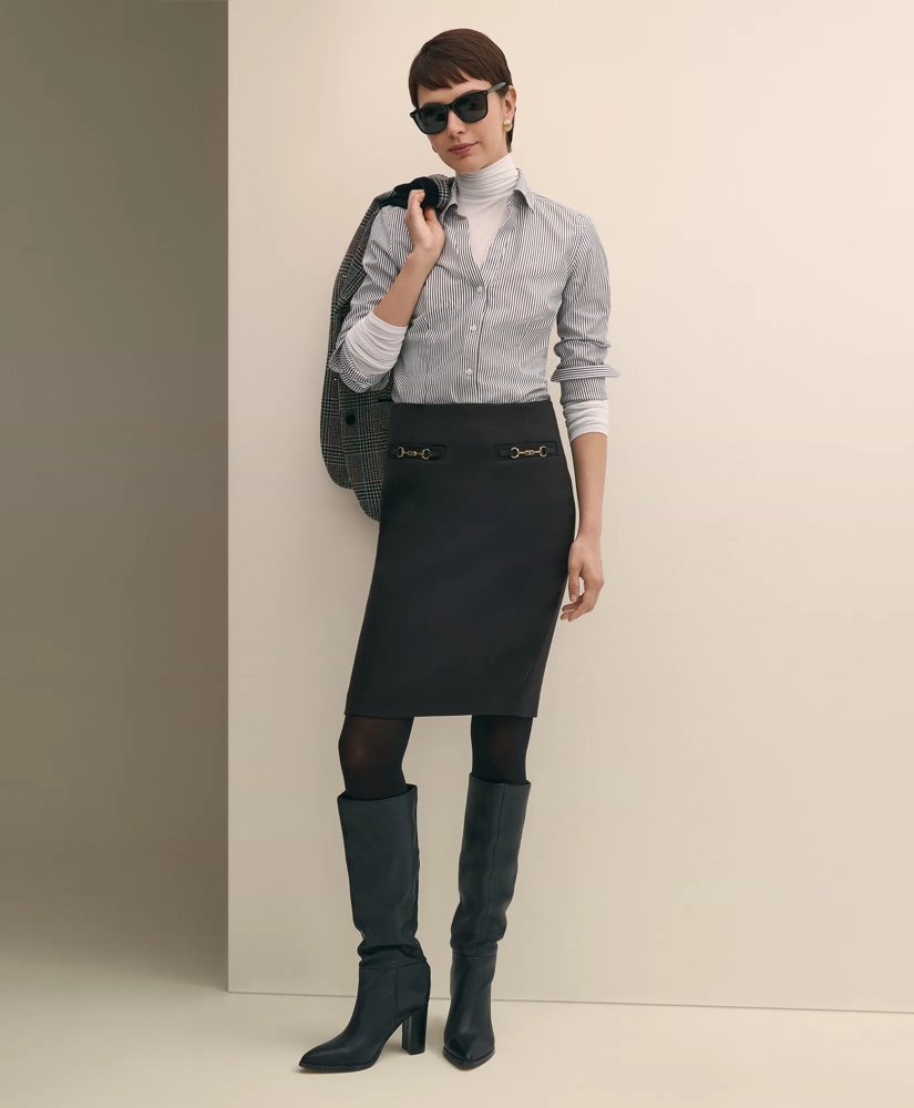 We elevated the quintessential pencil skirt, with our seasonal equestrian-inspired detail. Tailored to sit at the natural waist, it offers a sleek and sophisticated silhouette. Polished horsebit hardware adorns the welt pockets, adding a touch of iconic Brooks Brothers style.