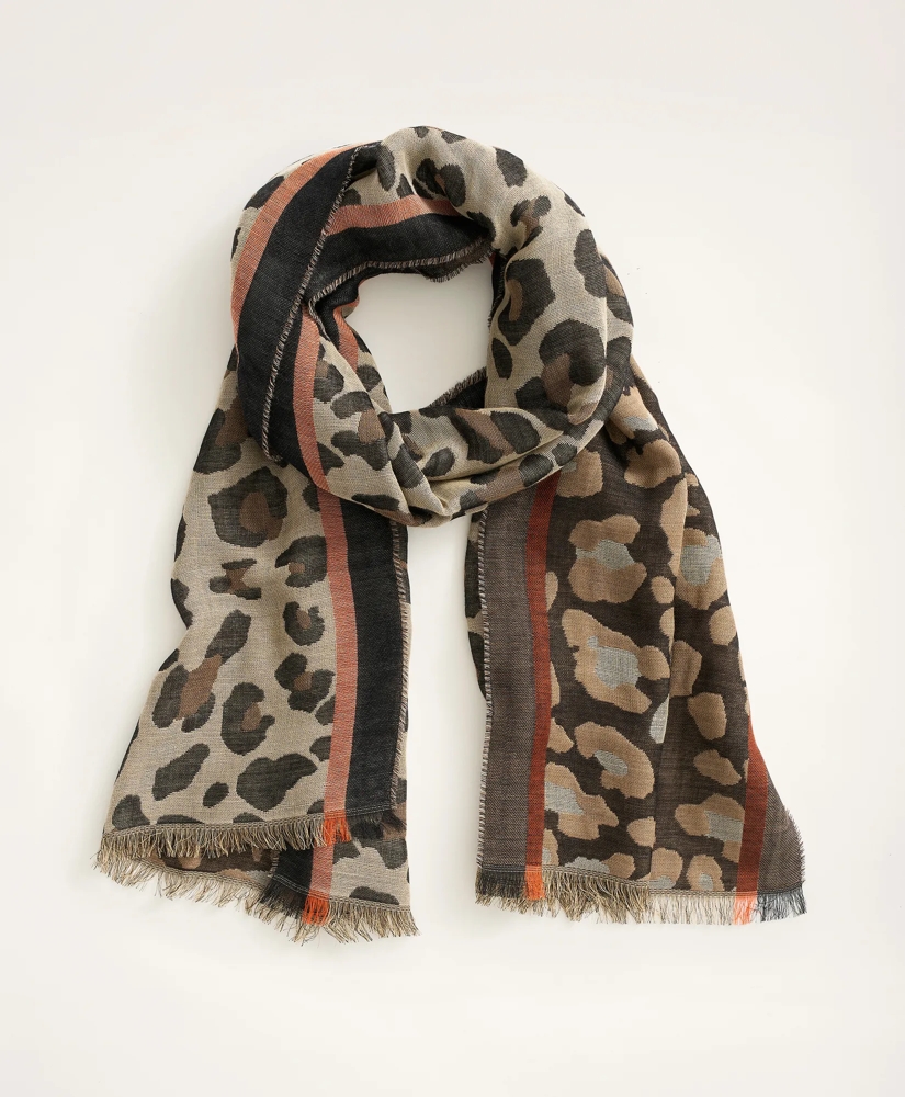 A chic leopard motif is woven into a beautiful jacquard scarf with a soft-fringe finish.