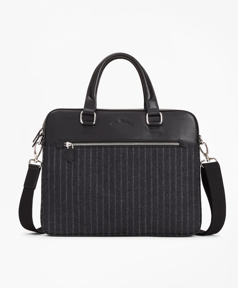 A classic briefcase style in a wool Harris Tweed woven in Italy featuring leather details for an elevated look. This bag features two-way zip closure, top carry leather handles and a removable, adjustable strap for shoulder to cross body wear. Includes black lining and silver hardware. 11" H x 14" L x 2" W.